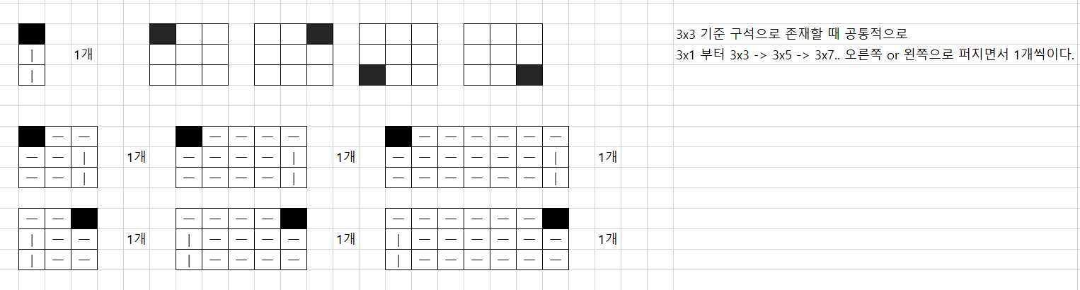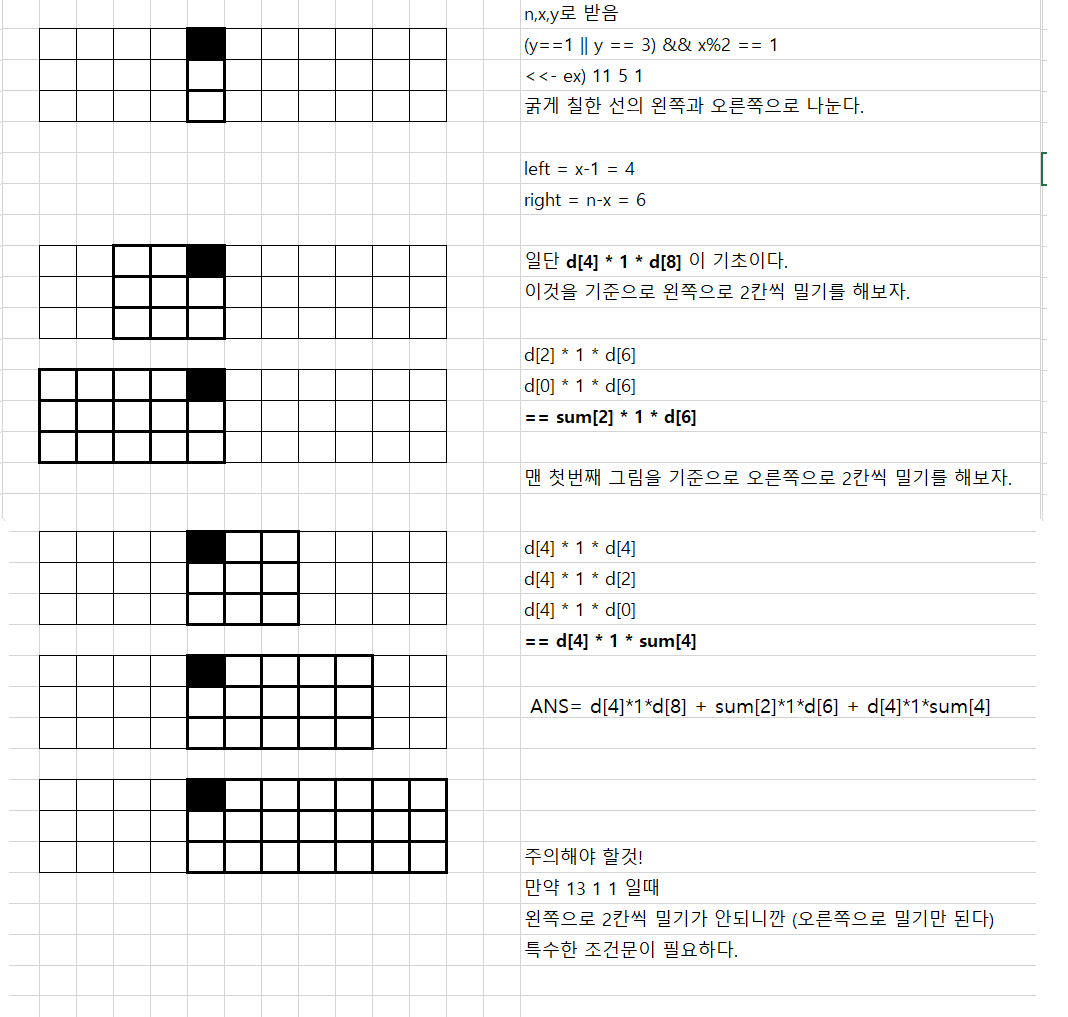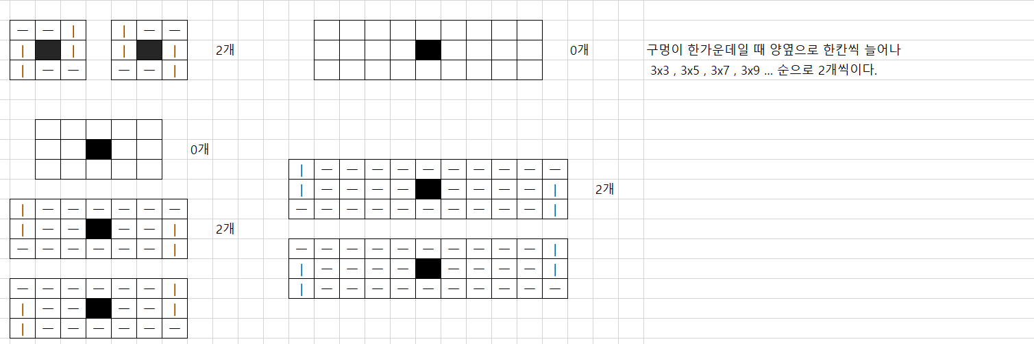 높이가 3, 너비가 N인 벽이 있다. N은홀수이며 이 벽을 1*2 크기의 타일로 빈틈없이 채우고자 한다. 단, 이 벽에는 한 칸의 빈 공간이 있어서 해당 공간만 빼고 모든 공간을 채워야 한다.