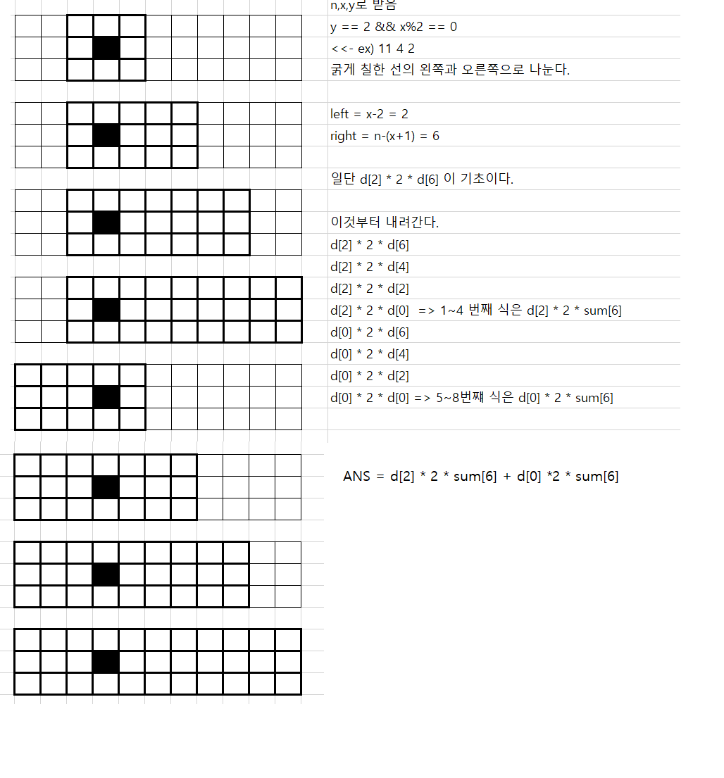 벽의 너비와 빈 공간의 좌표가 주어질 때 타일로 벽을 꽉 채울 수 있는 모든 경우의 수를 구하여라.